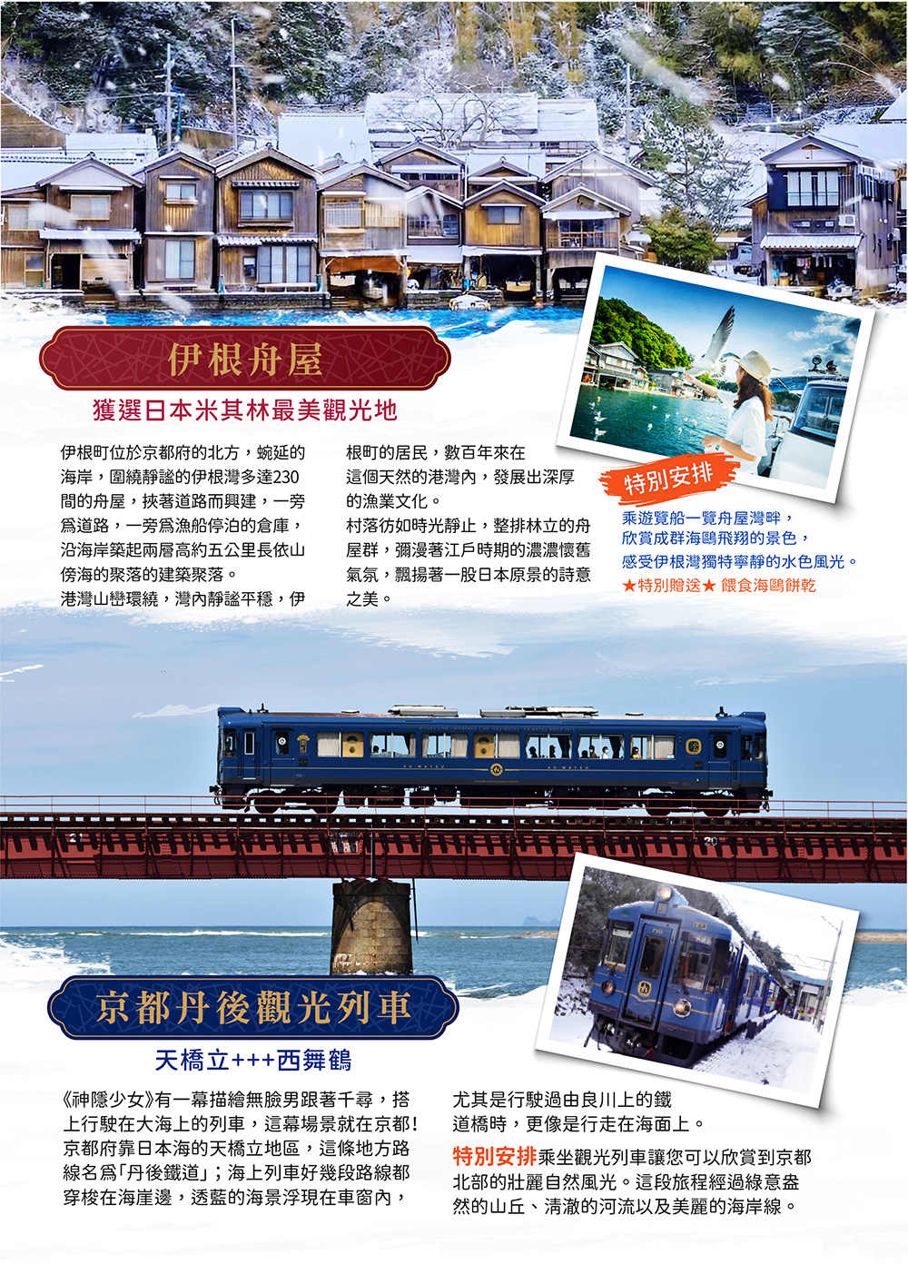【京都丹後觀光列車(天橋立-西舞鶴)】特別安排乘坐觀光列車讓您可以欣賞到京都北部的壯麗自然風光。這段旅程經過綠意盎然的山丘、清澈的河流以及美麗的海岸線。 ※備註:乘坐「京都丹後觀光列車」的安排會根據當天的列車班次進行調整,為了行程順暢,可能會乘坐普通列車,您依然能欣賞到丹後沿線的美麗風光。(如果幸運的話,或許有機會乘坐到「青松號」)。