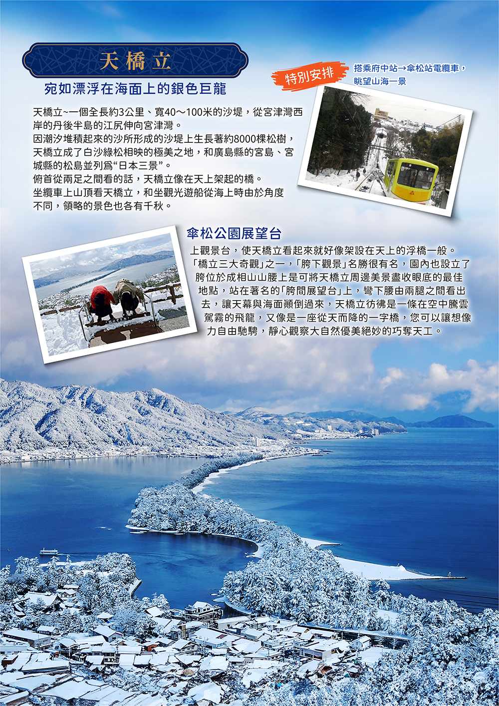 【天橋立】位於京都府的北部,在面臨日本海的宮津灣內。天橋立為一個全長約3公里、寬40~100米的沙堤,從宮津灣西岸的丹後半島的江尻伸向宮津灣。因潮汐堆積起來的沙所形成的沙堤上生長著約8000棵松樹,天橋立成了白沙綠松相映的極美之地,和廣島縣的宮島、宮城縣的松島並列爲“日本三景”。俯首從兩足之間看的話,天橋立象在天上架起的橋。 鄰接宮津側的橋的部分的是人工建成的迴旋橋,船經過此處時要回轉。坐纜車上山頂看天橋立,和坐觀光遊船從海上看時由於角度不同,領略的景色也各有千秋。