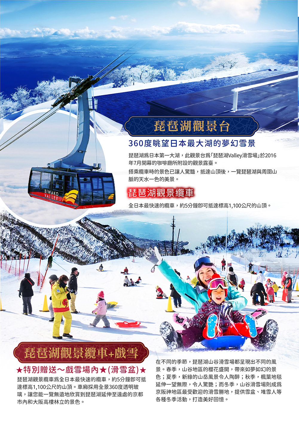 【琵琶湖觀景纜車~玩雪樂園(含雪盆)】全日本最快速的纜車,約5分鐘即可抵達標高1,100公尺的山頂。這裡的纜車車廂是採用全景360度透明玻璃,讓您能一覽無遺地欣賞到琵琶湖延伸至遠處的京都市內和大阪高樓林立的景色,將絕色美景盡收眼底。在不同的季節,琵琶湖山谷滑雪場都呈現出不同的風景。春季,山谷地區的櫻花盛開,帶來如夢如幻的景色;夏季,新綠的山岳風景令人陶醉;秋季,楓葉地毯延伸一望無際,令人驚艷;而冬季,琵琶湖Valley滑雪場則成為京阪神地區最受歡迎的滑雪勝地,提供雪盆、堆雪人等各種冬季活動,打造美好 回憶。