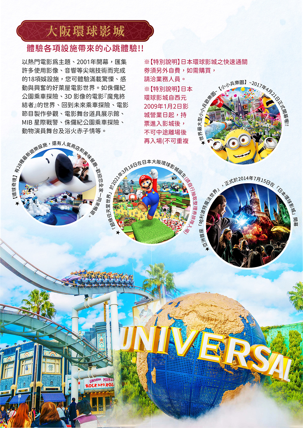 ※為方便遊玩今日午、晚餐敬請自理。 ※本日建議穿著輕便服裝,以便遊樂的方便。 ※本日如不參觀USJ:成人退費NT$1800.-、4~11歲退費NT$800.-、小孩3歲以下不退費。 (請於出團前10個工作天(不含週末及例假日)告知不前往,退費金額於團體出發前由團費中扣除,當地不予退費,敬請瞭解。)